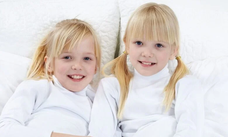 Blonde Zwillinge, 5 Jahre alt, lächeln, während sie Karten im Wohnzimmer halten | Quelle: Midjourney