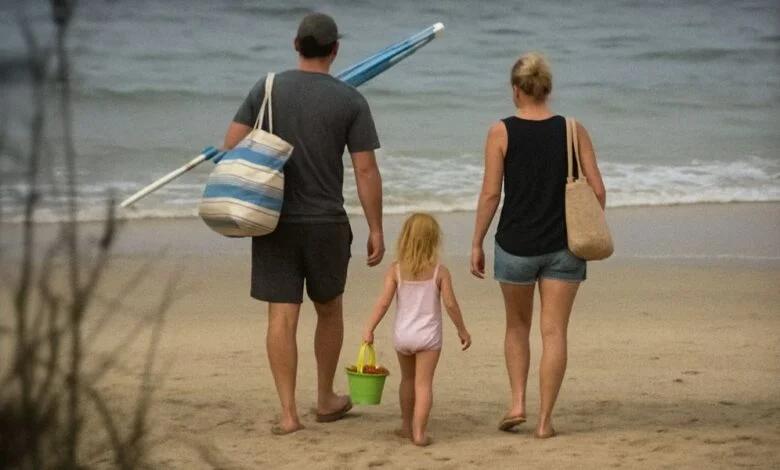Eine dreiköpfige Familie. Sie gingen am Strand entlang, lachten und überlegten, wo sie ihren Sonnenschirm aufstellen sollten. Ein Mann, eine Frau und ein kleines Mädchen – nicht älter als drei Jahre.