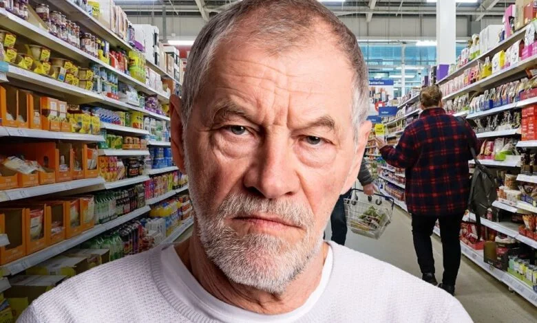 Ein wütend aussehender Mann steht in einem Gang eines Lebensmittelladens | Quelle: Midjourney