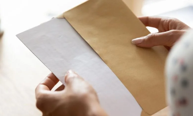 Eine erschrockene Frau mit einem Umschlag in der Hand | Quelle: Midjourney