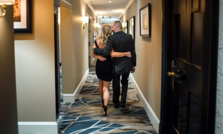Ein Mann und eine Frau gehen einen Hotelkorridor entlang | Quelle: Midjourney